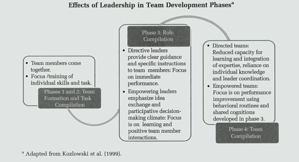 - Teams led by an empowering leader exhibit greater performance improvement in the later, team compilation, phase of development than teams led by a directive leader.