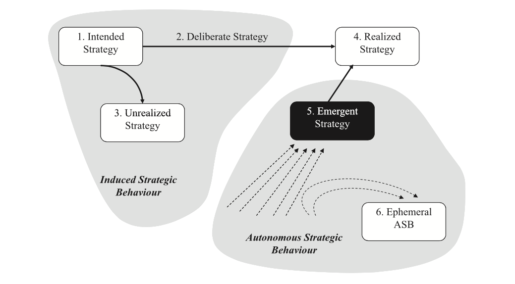 So Mintzberg put this intentionality management illusion to bed and we now know there is sometimes intentional strategy but there is also very often emergent strategy originating from autonomous strategic behaviour within the company.